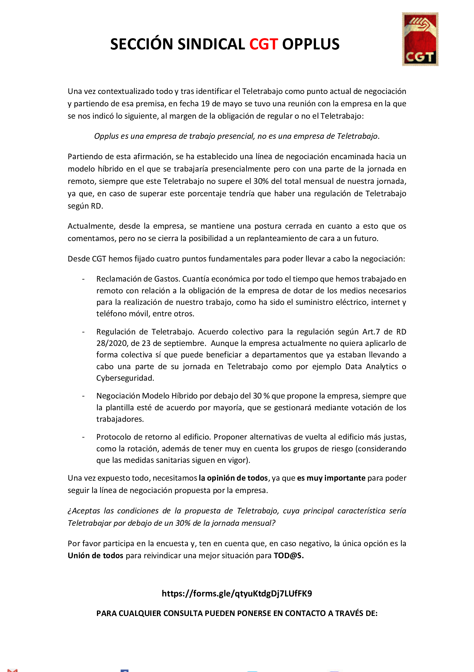 Comunicado y video de Teletrabajo junio 1, 2021 admin Comunicados RESPONDE A LA ENCUESTA: https://forms.gle/nzB2g6YczayqZhZX6