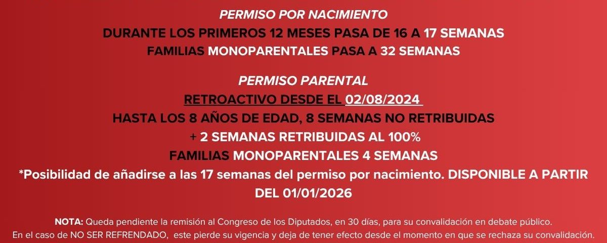 - PERMISO DE NACIMIENTO DE HIJO/A, pasa DE 16 A 17 SEMANAS, retribuidas al 100 %, que deben ser disfrutadas dentro del primer año de vida. Las 6 primeras deben ser disfrutadas ininterrumpidamente a continuación del parto, mientras que el resto se pueden repartir a lo largo del periodo, eso si, agrupadas por semanas completas. En el caso de las familias monoparentales, este permiso se amplia hasta las 32 semanas.